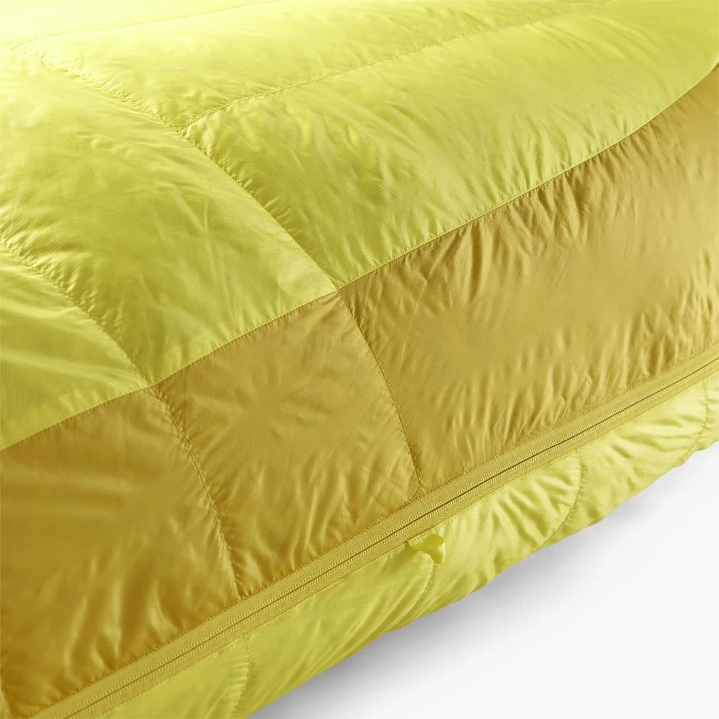 Zip je podél celé levé strany spacáku, má dva jezdce a umožní tak extra větrání, zároveň má krycí légu proti úniku tepla. Druhý zip na pravé straně pouze do 1/3 pro lepší zaplutí do spacáku v horských podmínkách. Vertikální komory na prsou jako prevence proti přesypávání peří. V oblasti těla je více peří než v nohách.