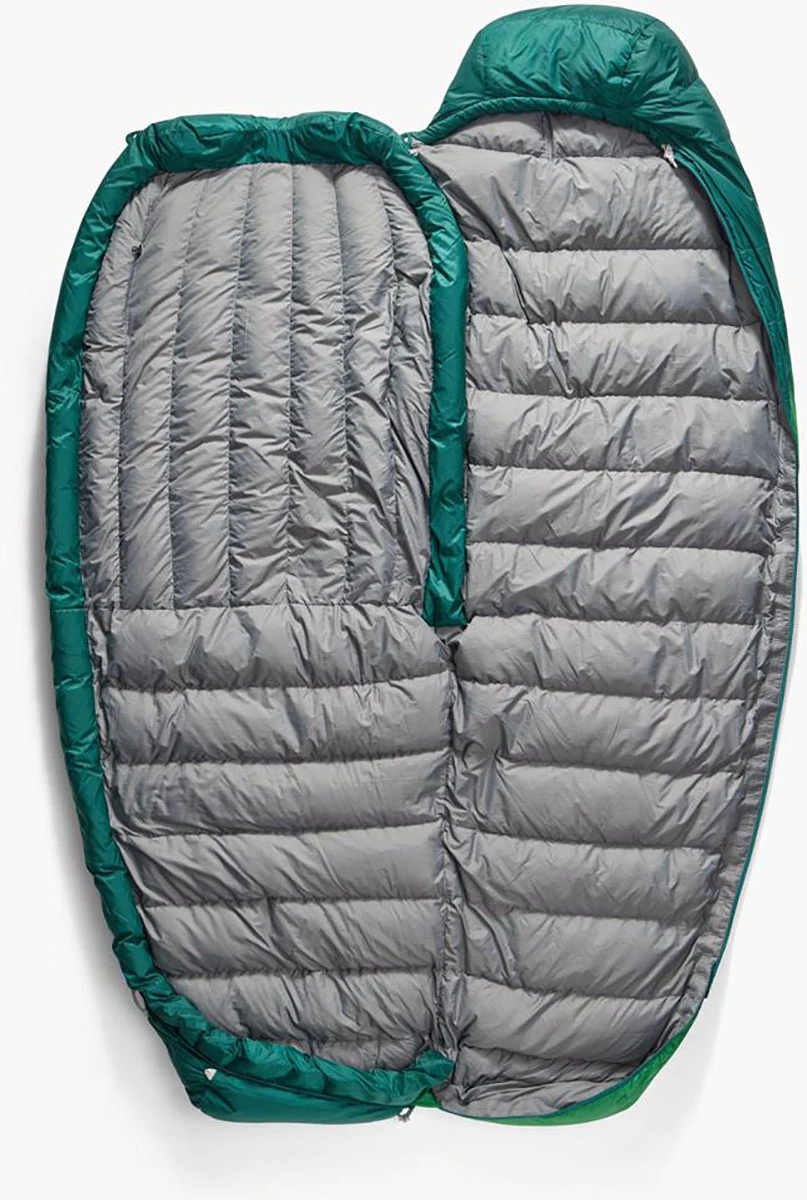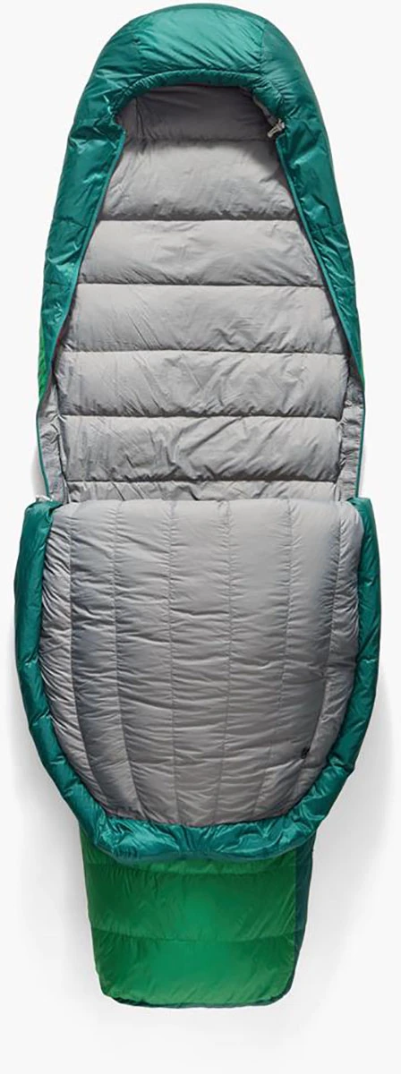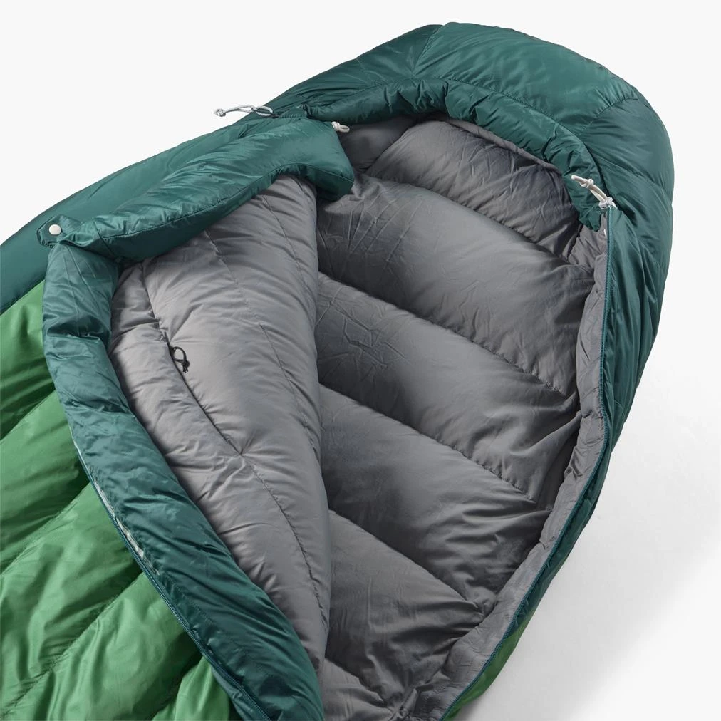 Zip je podél celé levé strany spacáku, má dva jezdce a umožní tak extra větrání, zároveň má krycí légu proti úniku tepla. Navíc má také zip na pravé straně spacáku, poskytuje tak volný pohyb pro obě paže a další větrání a znamená. Celou horní polovinu lze sklopit. Svislé přepážky na hrudi optimalizují polohu peří, aby se zabránilo jeho sesouvání během používání.