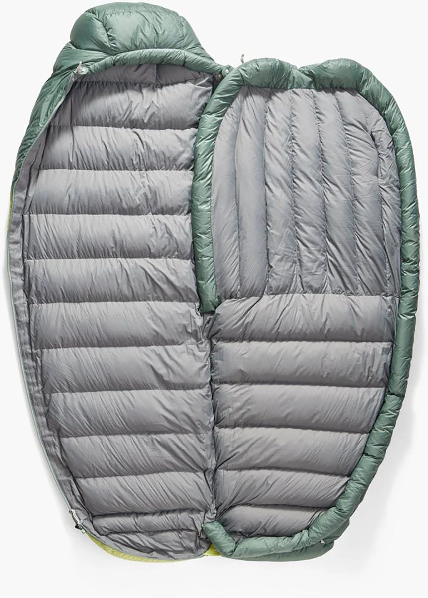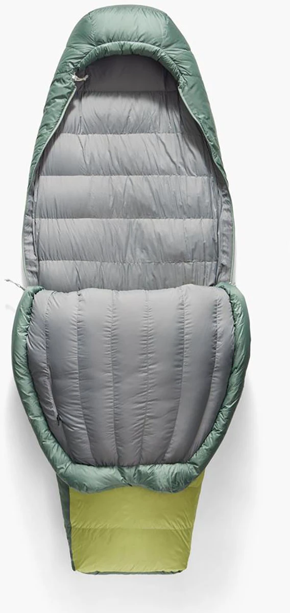 Hlavní zip je podél celé pravé strany spacáku, má dva jezdce a umožní tak extra větrání, zároveň má krycí légu proti úniku tepla. Další zip je na levé straně, celou horní polovinu lze tak sklopit, což poskytne volný pohyb pro obě paže a další větrání.