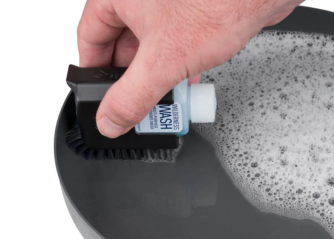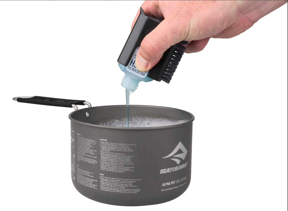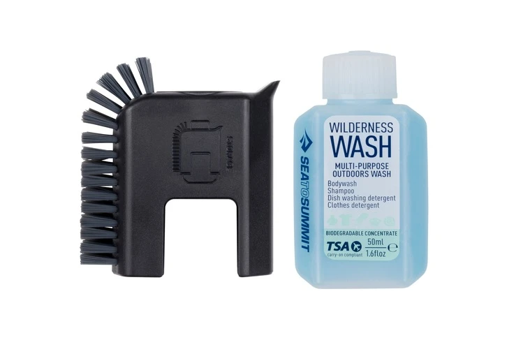 Drátěnka je vyrobena z polypropylenu a odolných nylonových štětin s integrovanou škrabkou. Mycí prostředek Wilderness Wash je koncentrovaný a biologicky odbouratelný. (ve vzdálenosti nejméně 100 m od vodních toků)