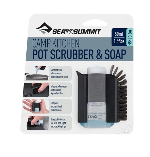 Sea to Summit Camp Kitchen Pot Scrubber 2 Piece Set: Dvoudílný set na umývání vašeho nádobí při kempování, cestování nebo turistice. Díky jeho malým rozměrům se vejde do jakéhokoliv zavazadla, navíc se velice dobře drží a používá. Drátěnka je vyrobena z polypropylenu a odolných nylonových štětin s integrovanou škrabkou. Nylonové štětiny jsou účinné proti zbytkům potravin, ale nepoškodí nepřilnavé povrchy. Integrovaná škrabka se hodí pro mytí velice odolných skvrn. Mycí prostředek, který je součástí balení, je vysoce koncentrovaný a zcela biologicky odbouratelný ve vzdálenosti nejméně 100 m od vodních toků.