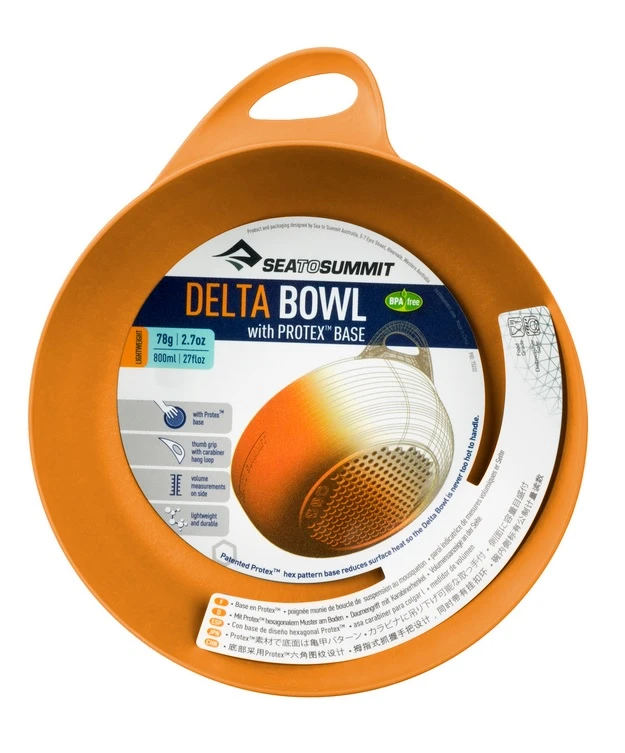 Sea to Summit Delta Bowl: lehká a odolná miska od výrobce Sea to Summit z velice oblíbené řady Delta. Miska je vhodná na běžné používání, do kempu, nebo na expedice. Patentovaný systém ProtexTM izoluje dno nádobí tak, aby se uživatel nepopálil od horkých nápojů nebo jídel. Lze ji použít jako misku nebo jako talíř. Navíc má praktické ucho s tvarováním na palec, a otvorem na karabinu poskytující snadný úchop a uskladnění nádobí.