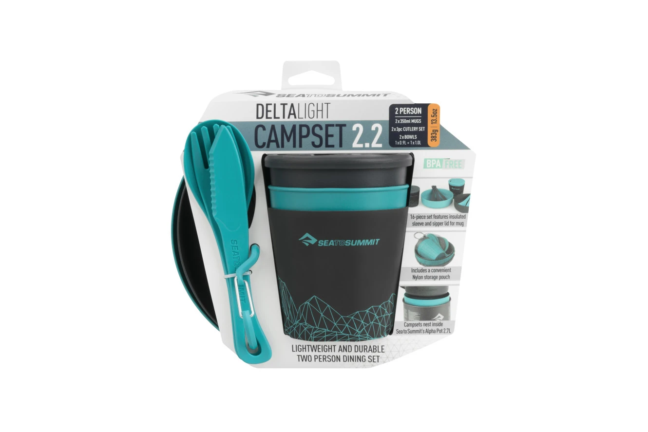 Sea to Summit DeltaLightTM Camp Set 2.2 - cestovní set nádobí pro dvě osoby. Tato prostorově úsporná sada se skládá z 2x misky DeltaLight ™, 2x hrnku a 2x příborů Delta a sbalíte jí do lehkého úložného pouzdra.