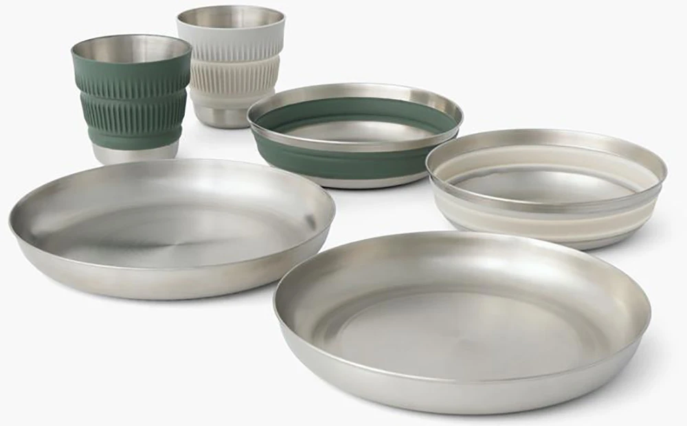 Sea to Summit Detour Stainless Steel Collapsible Dinnerware Set - sada nádobí na kempování vyrobená z nerezové oceli, na dně má nádobí silikonovou protiskluzovou úpravu. Hrnky a misky jsou skládací a vše se dá poskládat do sebe aby se ušetřilo místo při přepravě.