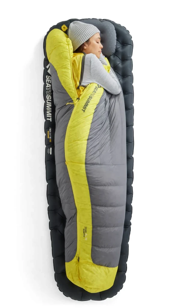 Sea to Summit Ether Light XR Pro Insulated Rectangular Large Wide: velmi lehká a pohodlná 10 cm tlustá nafukovací karimatka s izolací pro celoroční tepelný komfort. Díky tloušťce karimatky a jejímu konstrukčnímu řešení v podobě smyčkových přepážek, se vám při otáčení boky zaboří hlouběji do matrace, ale nedotknout se země.