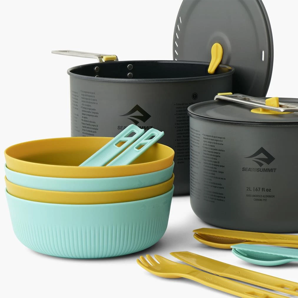 Sea to Summit Frontier UL Two Pot Cook Set [4P] [14 Piece] - sada lehkého a vysoce kvalitního nádobí pro 4 osoby. Set obsahuje dva hrnce o objemu 2l a 3l, čtyři střední misky a čtyři vidličky a nože.
