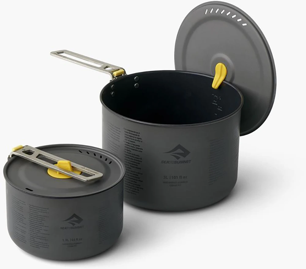 Sea to Summit Frontier UL Two Pot Set [2Piece] 1.3L and 3L Pots - sada dvou cestovních hrnců s vysokou odolností a funkčností. Jsou vyrobeny z odolného tvrdého eloxovaného hliníku, což jim umožňuje být tenčí a lehčí, ale stále extrémně pevné a odolné.