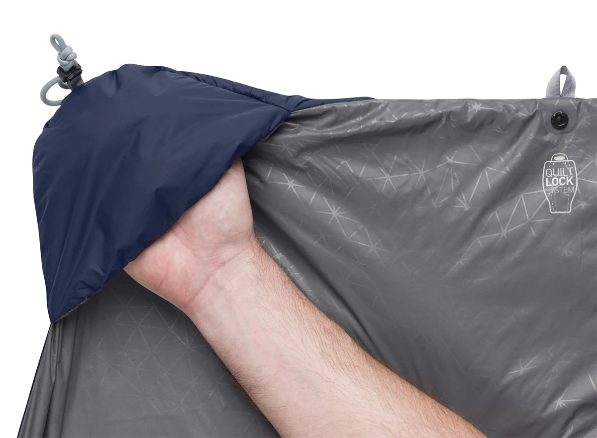Když teplota naopak klesá lze stahovací šňůru pevně přitáhnout a vytvořit tak kapsu pro nohy, přikrývka navíc disponuje systémem popruhu a patentního knoflíku, který slouží k připevnění karimatky k přikrývce, čímž se minimalizují tepelné ztráty. Přikrývka má systém QuiltLock pro spojení s jakýmkoli spacákem Sea to Summit, který zabraňuje jejímu sklouznutí.