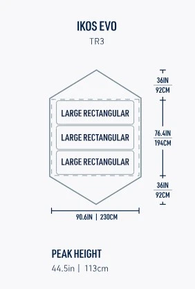 Sea to Summit Ikos Evo Tent TR3: Ikos Evo 3 je zhmotněním prostornosti a odolnosti. Zatímco ultralehké stany pro tři osoby bývají často stísněné a vyžadují křehké materiály, Ikos využívá technologii Tension Ridge™ (pruty ohnuté vzhůru), která vytváří vertikální stěny. Výsledkem je interiér, kde se tři dospělí lidé mohou pohodlně posadit, převléknout nebo trávit čas během deštivého odpoledne, aniž by se museli krčit.