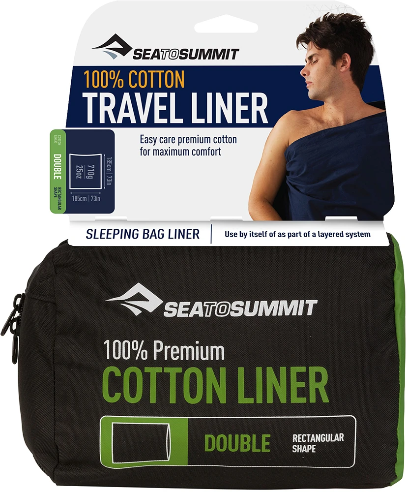 Sea to Summit Premium Cotton Travel Liner Double - vložka do spacáku pro dva vyrobená ze 100% bavlny. Udrží váš spacák v čistotě a prodlouží tak jeho životnost. Vložka z bavlny se snadno udržuje, je velmi příjemná a pohodlná. Lze také použít jako samostatnou přikrývku v teplém počasí popř.na chatě.
