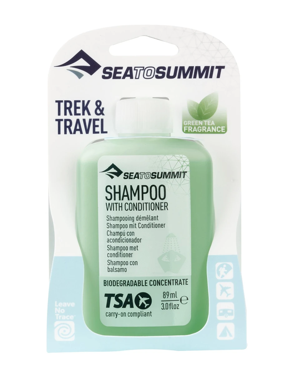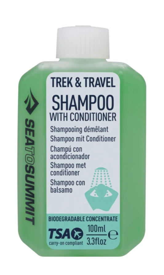 Šampon a kondicionér Sea To Summit: je koncentrovaný přípravek 2 v 1 s vůní zeleného čaje. Na umytí vlasů stačí jedno víčko přípravku. Hodí se na kempování, stanování, výpravy do hor nebo cestování letadlem. Má neutrální pH a označení biodegradability, takže je v přírodě biologicky odbouratelný.