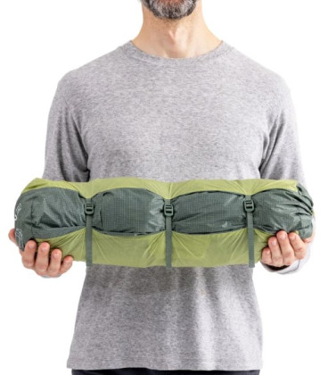 FairShare Storage System: Stan je rozdělen do tří vaků. V tříčlenné skupině si tak každý může vzít svou část (pruty / tropiko / vnitřní stan), čímž se váha rozloží na zanedbatelných cca 650 g na osobu.