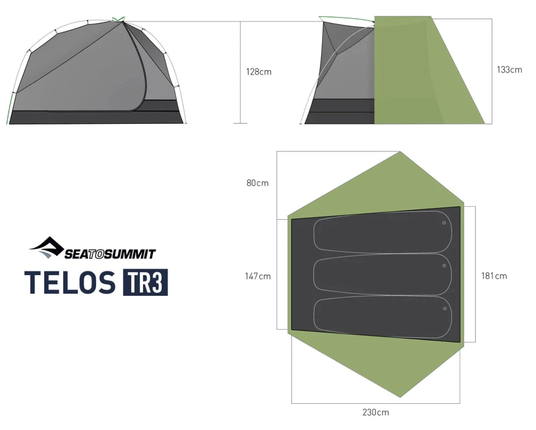 Sea to Summit Telos TR3: ultralehký volně stojící stan pro tři osoby. Stan má samostatnou konstrukci, vodní sloupec podlážky je 2500 mm. Systém Tension Ride zvedá tvar stanu nahoru a tím poskytuje více prostoru pro hlavu a ramena. V nejvyšším bodě stanu je ventilační otvor Apex Vent, který se dá uzavřít zipem. Stan má dva vchody a dvě předsíňky, poskytuje tak dostatek místa i pro batohy a další vybavení.