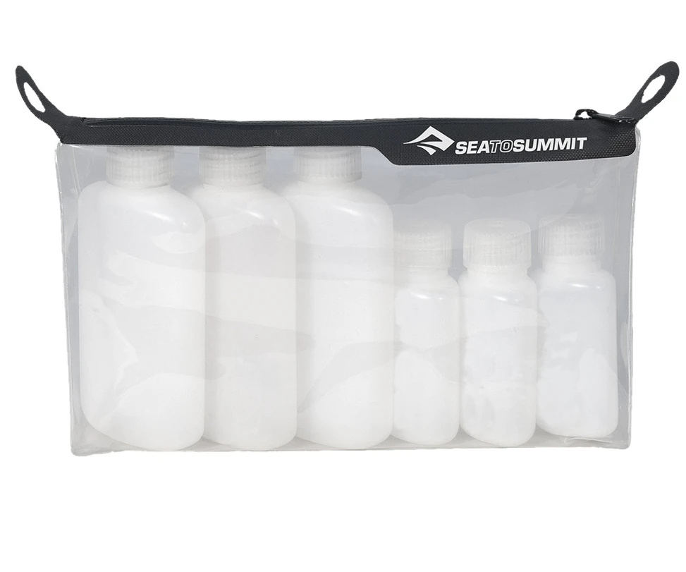 Sea To Summit TPU Clear Ziptop Pouch: průhledné pouzdro na zip s lahvičkami na kosmetické přípravky, splňující požadavky TSA pro tekutiny a gely v příručních zavazadlech v letadle.