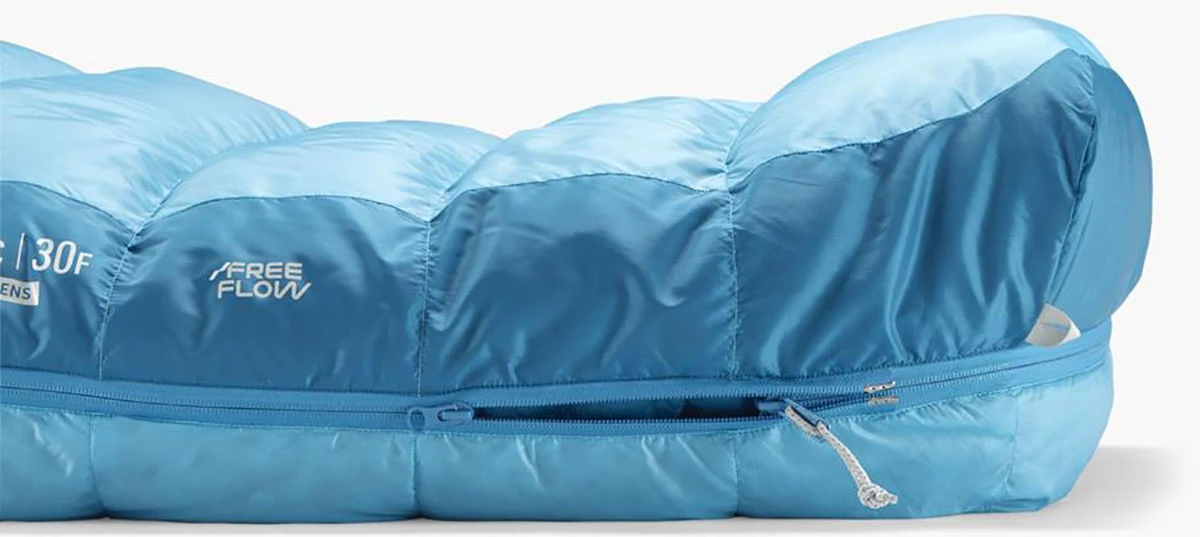 Spacák má obousměrný zip, takže poskytne ventilaci a další možný prostor u nohou. Hlavní zip je na pravé straně, je celo propínací se dvěma jezdci. Další kratší zip na levé straně umožní, že lze horní polovinu rozepnout a uvolnit tak paže. Celou horní polovinu lze sklopit.