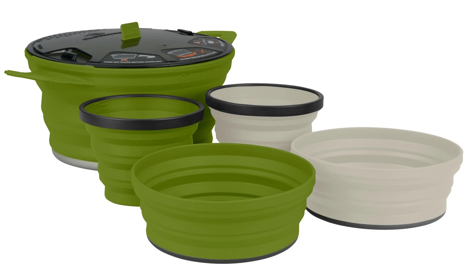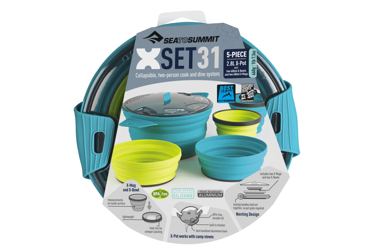 Sea to Summit X-Set 31 - set skladného cestovního nádobí pro 2-3 osoby. Set obsahuje hrnec o objemu 2,8 l, 2x hrnek (480 ml) a 2x misku (600 ml), nádobí lze vložit do sebe a ušetří tak spoustu místa.