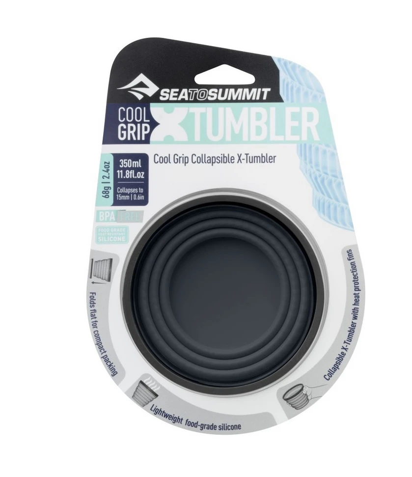 Sea to Summit X-Tumbler Cool Grip 350ml: jedná se o skládací termoizolační pohárek o objemu 350 ml. Inovativní konstrukce Cool Grip využívá speciálně navržená žebra, která chrání vaše prsty před teplem nápoje - a díky pevnému okraji je navíc pohárek pevný a snadno se z něj pije. Velice jednoduše ho složíte do placky 15 mm vysoké, díky čemuž vám nezabere v batohu téměř žádné místo. Pohárek má ideální velikost na kávu, čaj, nebo víno.
