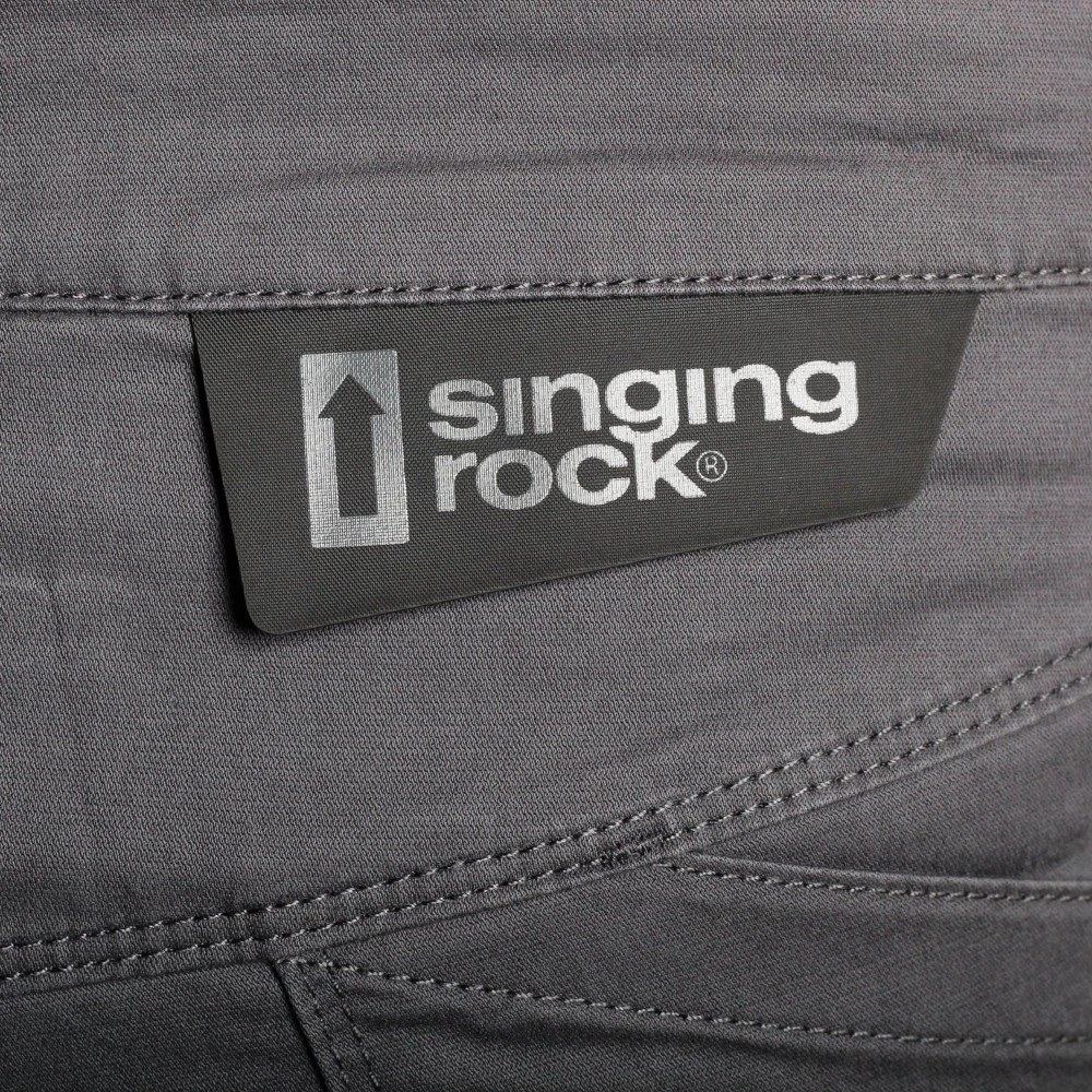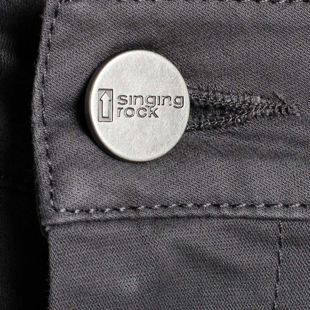 zapínání kalhot s kovovým zipem YKK a kovovým knoflíkem s logem Singing Rock