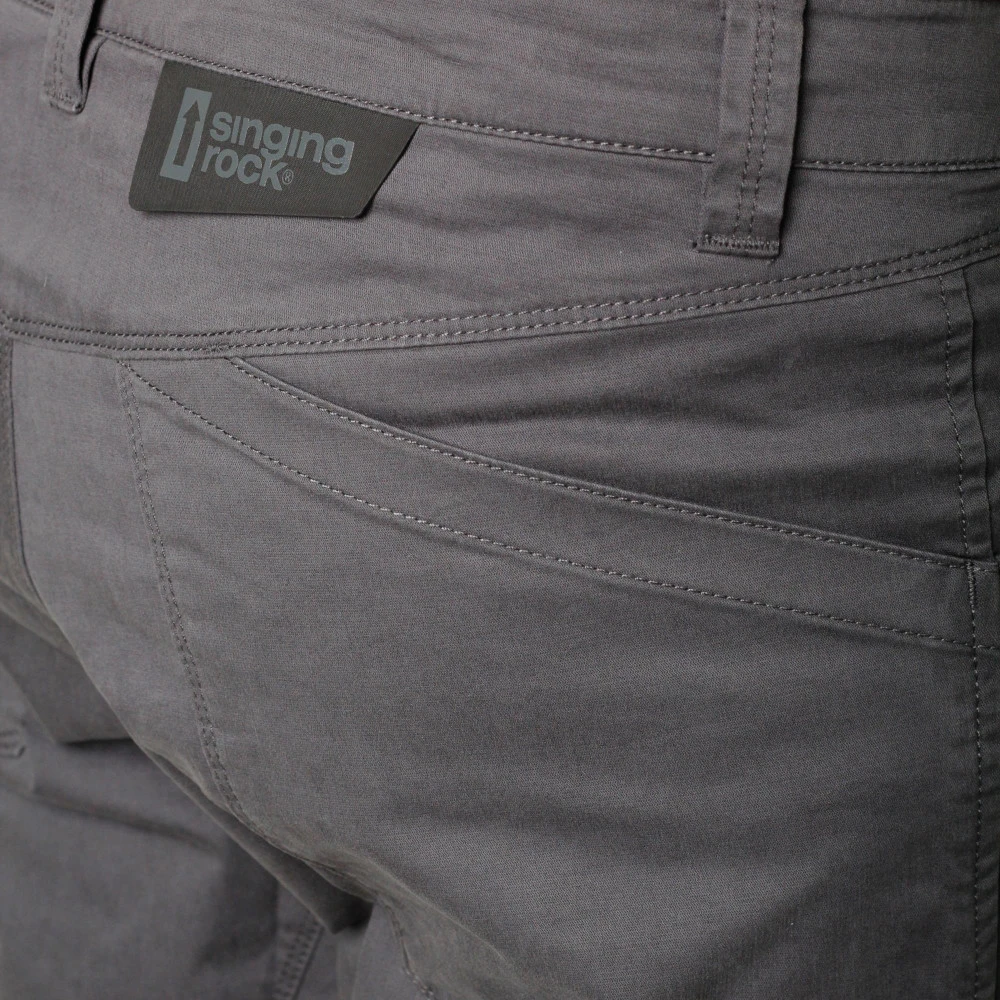 zapínání kalhot s kovovým zipem YKK a kovovým knoflíkem s logem Singing Rock