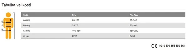 Hmotnost: 2250 [vel. S/M/L] (± 15 g); 2450 g [vel. XL/XXL] (± 15 g)