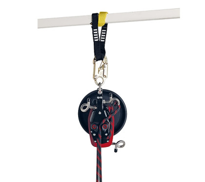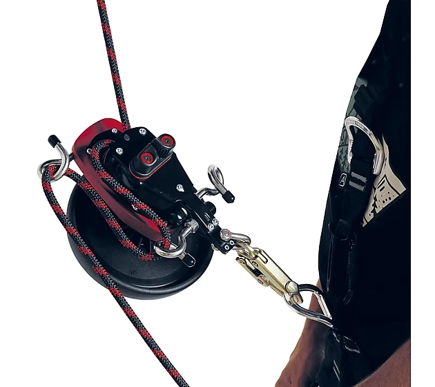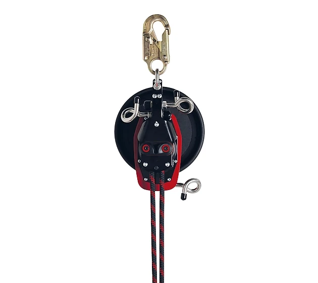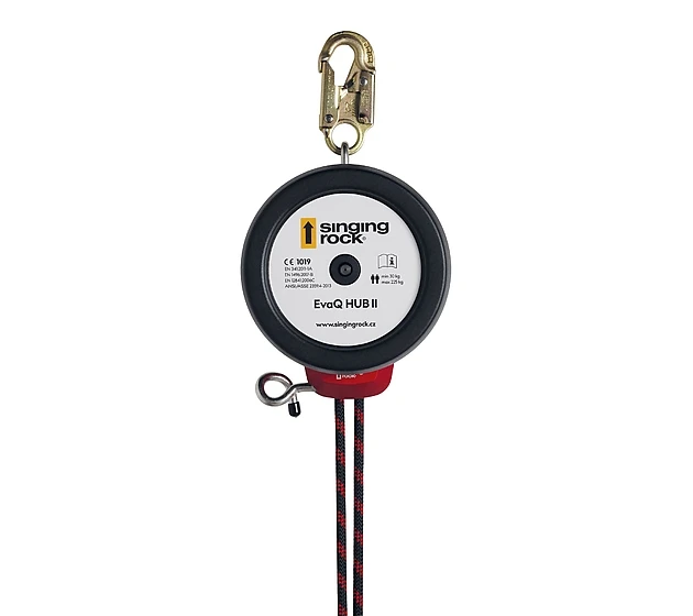 Singing Rock Evaq Hub II s lanem: je slaňovací a záchranné zařízení. Má možnost zdvihnutí. Pracovní zatížení až 225 kg.