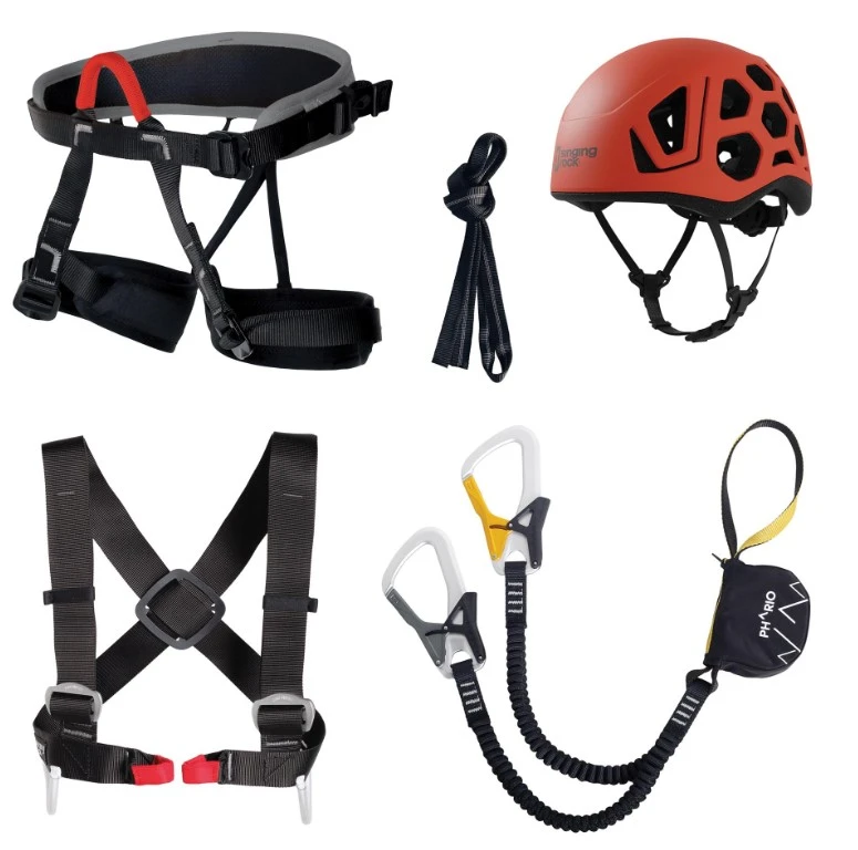 Sedací úvazek Top Rental je lehký, polstrovaný, s odepínacími nohavičkami vzadu a barevně odlišeným jisticím okem pro bezpečné navázání. Prsní úvazek Aladin zajišťuje zvýšenou ochranu při dlouhých pádech a pro vyšší bezpečnost je součástí spojovací smyčka. Ferratová brzda Phario Palm s dlaňovými karabinami key lock nabízí maximální bezpečí – karabiny automaticky blokují zavřenou polohu a odemknou se pouze sevřením v ruce. Tlumič pádové energie funguje na principu párání švů a je testován na použití s váhou 40–120 kg, spolehlivě snižuje sílu při pádu i větších postav. Přilba Hex je vyrobená z ABS a EPP skořepiny, má 35 větracích otvorů, lze ji snadno nastavit na velikost hlavy kolečkem, vnitřní polstrování je odnímatelné a pratelné, s klipy na čelovku.