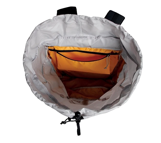 při odstranění vrchlíku vstup do hlavní komory ochrání klopa, kterou vyroluješ z kapsy nad ramenními popruhy; ideální řešení pro lehký styl