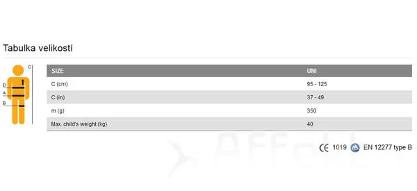 – jedna velikost určena pro děti s výškou 95–125 cm a max. váhou 40 kg