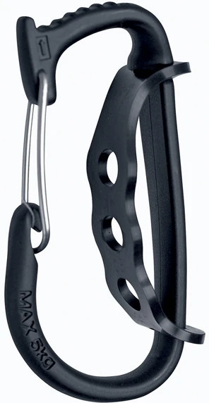 Nosič materiálu Singing Rock Porter: plastová karabina určená pro připnutí pracovního vybavení nebo nářadí na pracovní postroj. Rozšíříte tak počet a možnosti poutek u úvazku. Nacvakává se do slotů pro to určených.