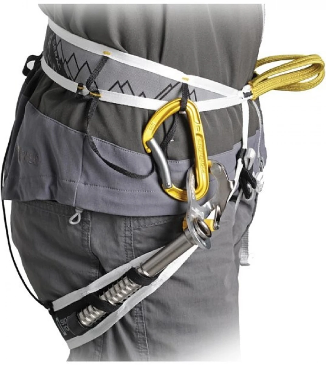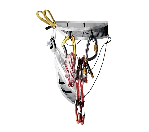 Bederní pás se nastavuje pomocí stahovacího lanka. Sedák má dvě materiálová oka. Do slotu lze také umístit pomocnou Porter karabinu třeba pro šrouby do ledu.