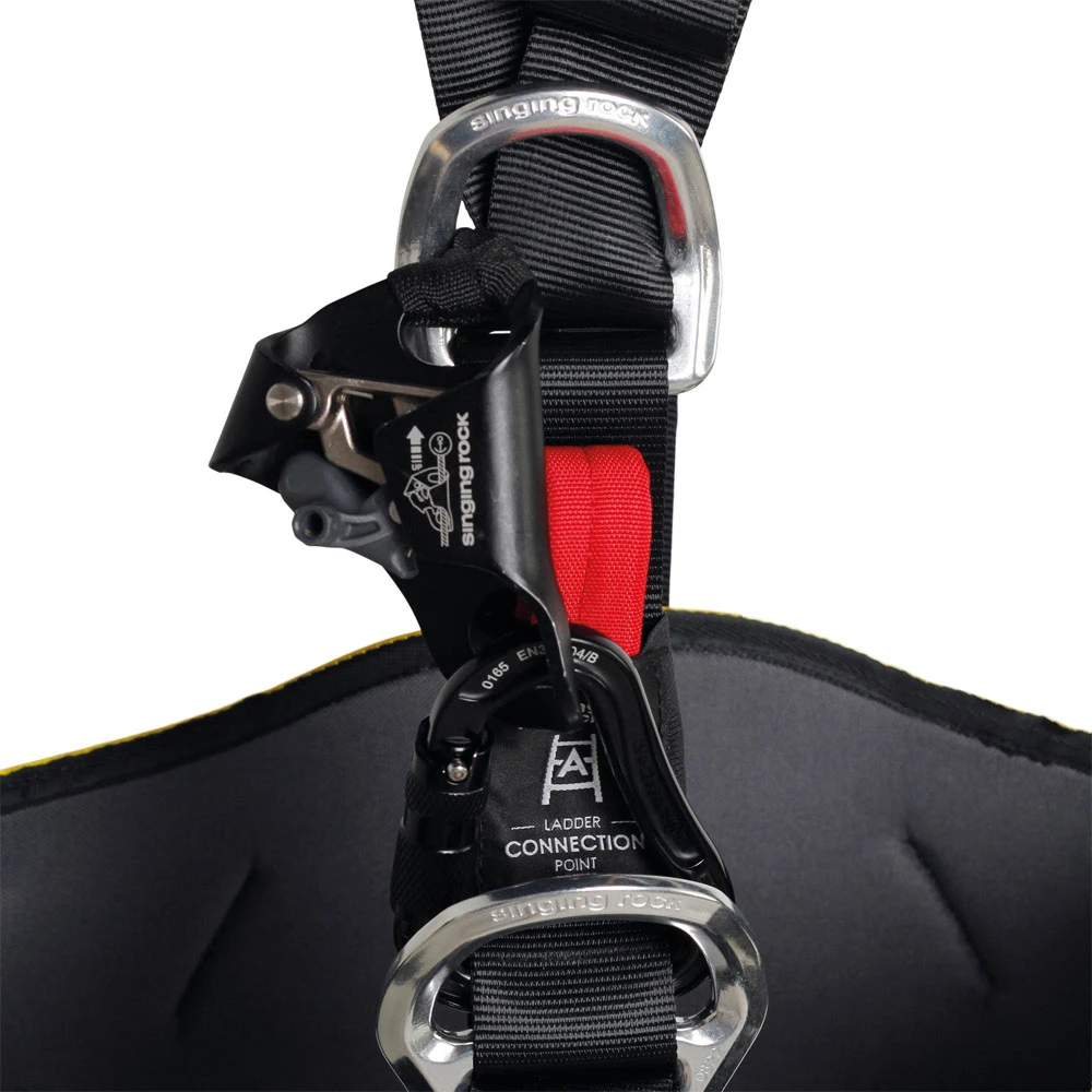 vpředu pod hrudníkem je další, specifický zachycovací bod EN 361 LADDER CONNECTION POINT určený pro připojení k záchytným systémům proti pádu osob EN 353-1, který umožňuje volnější pohyb po zajištěných žebřících a konstrukcích