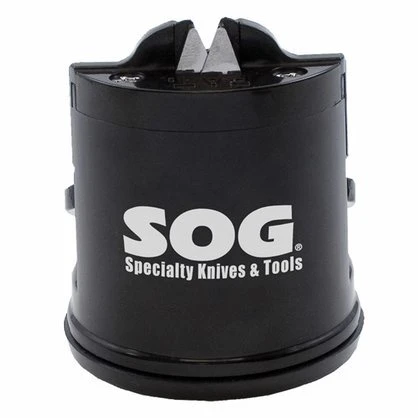 Sog Countertop Sharpener: je stolní brousek na jakýkoliv rovný neporézní povrch. Malý a snadno přenosný. Zanechává nože s ostrým ostřím jako břitva. Technologie odsávání poskytuje minimální námahu. Nízká hmotnost. Rychlé a snadné. Stačí aktivovat odsávání a protáhnout nože, aby získali ostré ostří.