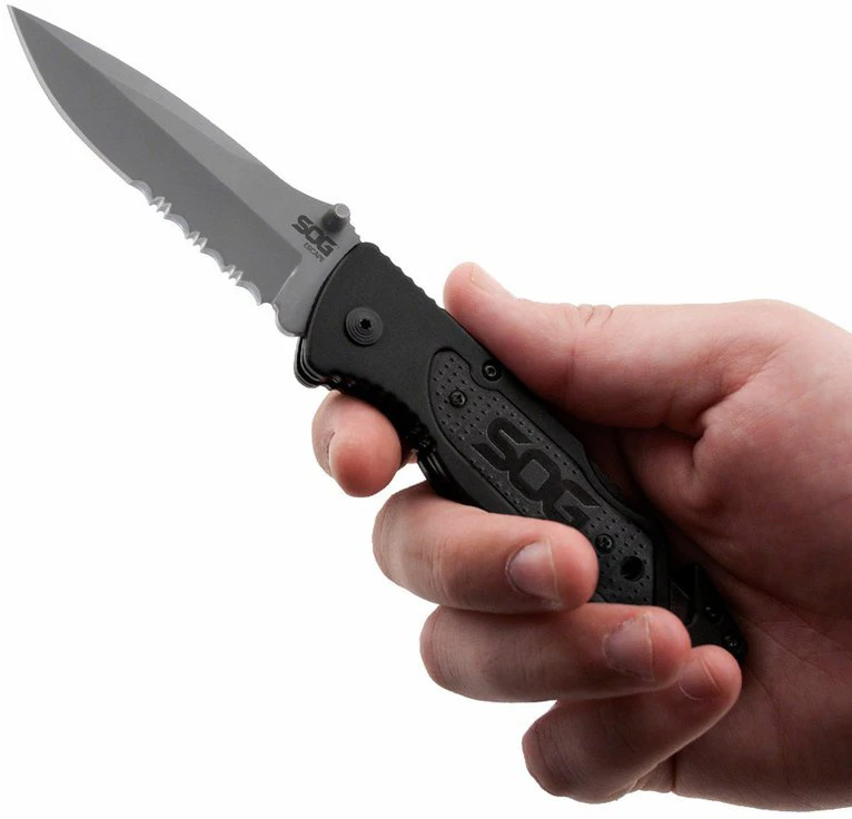 Má kombinované ostří na čepeli, můžete ho využívat na řezání čehokoliv od bezpečnostních pásů v autě až po chleba. Otevřete ho jednou rukou.
