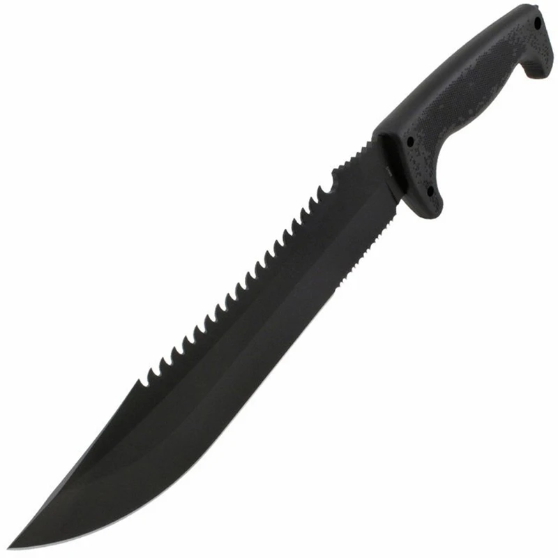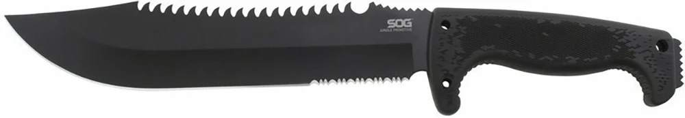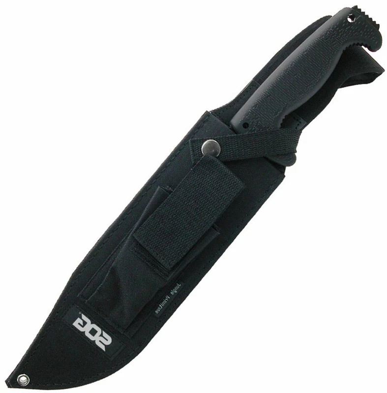 Sog Jungle Primitive - je rozměrný nůž (téměr 40 cm)modifikovaného, ale tradičního bowie tvaru. Díky tomu se hodí pro campingové nebo bushcraftové aktivity, kdy ho můžete použít na sekání, kácení menších stromků nebo jako mačetu. Vrchní strana je použitelná jako pilka.