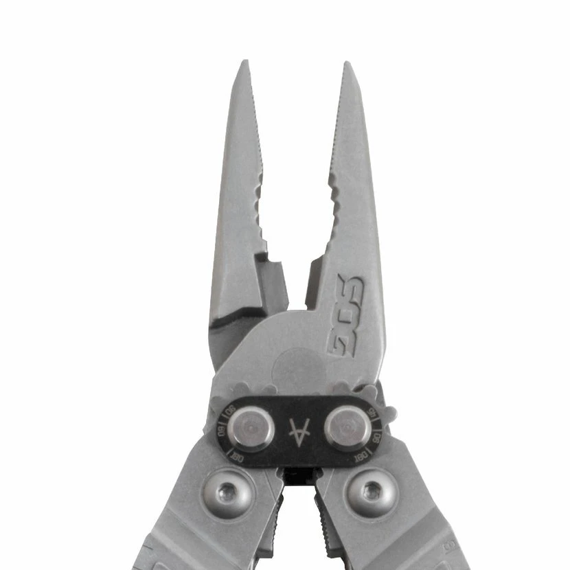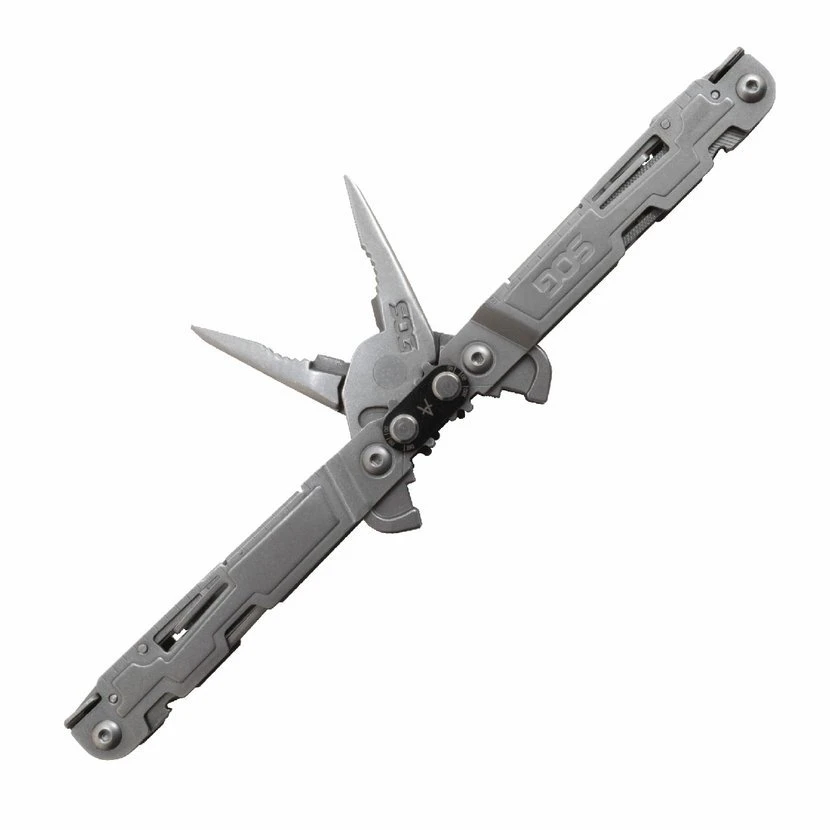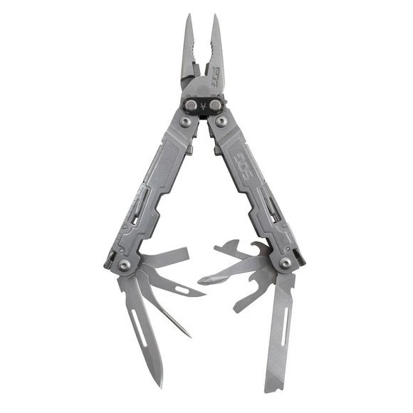 Komponenty: kleště na uchopení, štípací kleště na měkké a tvrdé dráty, krimpovací kleště, otvírák na konzervy, malý plochý šroubovák, křížový šroubovák, otvírák na láhve, střední plochý šroubovák, třístranný pilník, rovný nůž, šperhák, šídlo, velký plochý šroubovák, pravítko, úhloměr, magnetický šestihranný bitový ovladač.