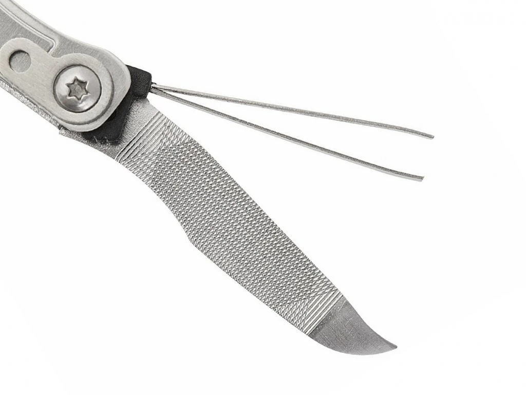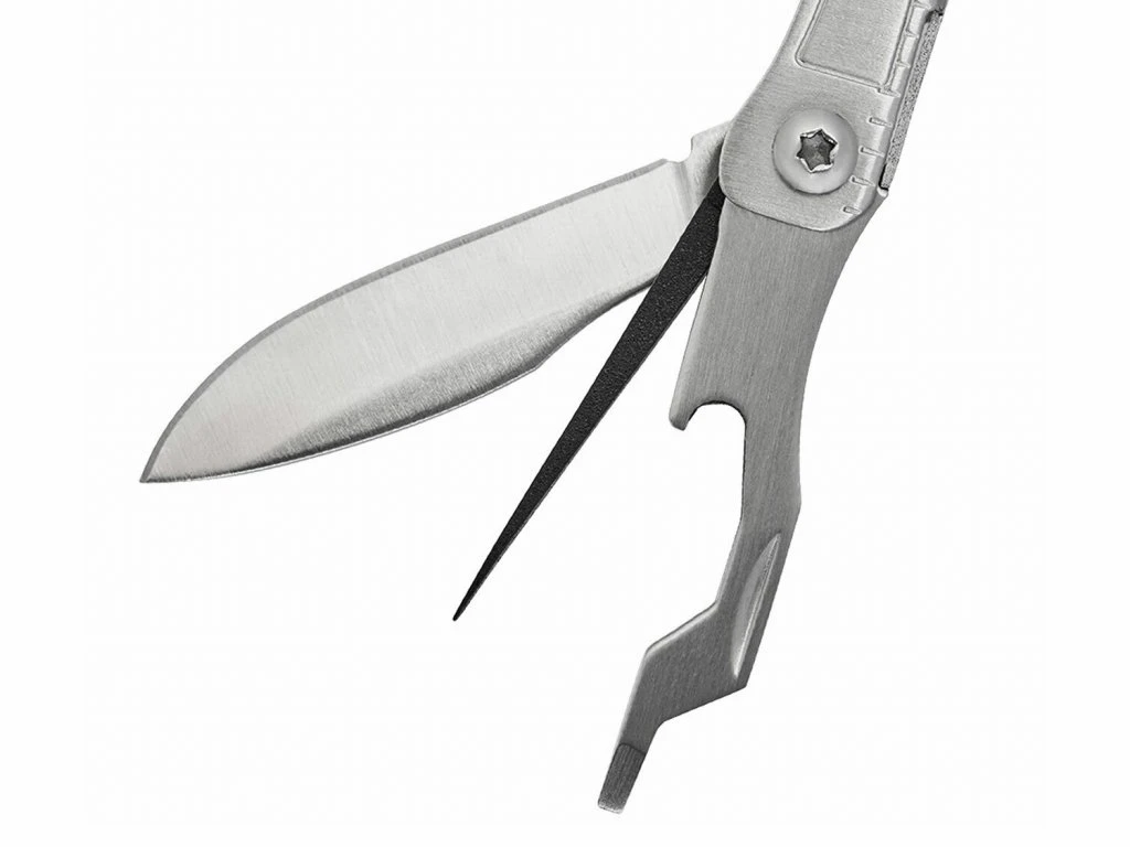 Komponenty: čepel, nůžky, párátko, otvírák na láhve, čepel nože, pilník na nehty, plochý šroubovák, pinzetu, šídlo, měřítko.