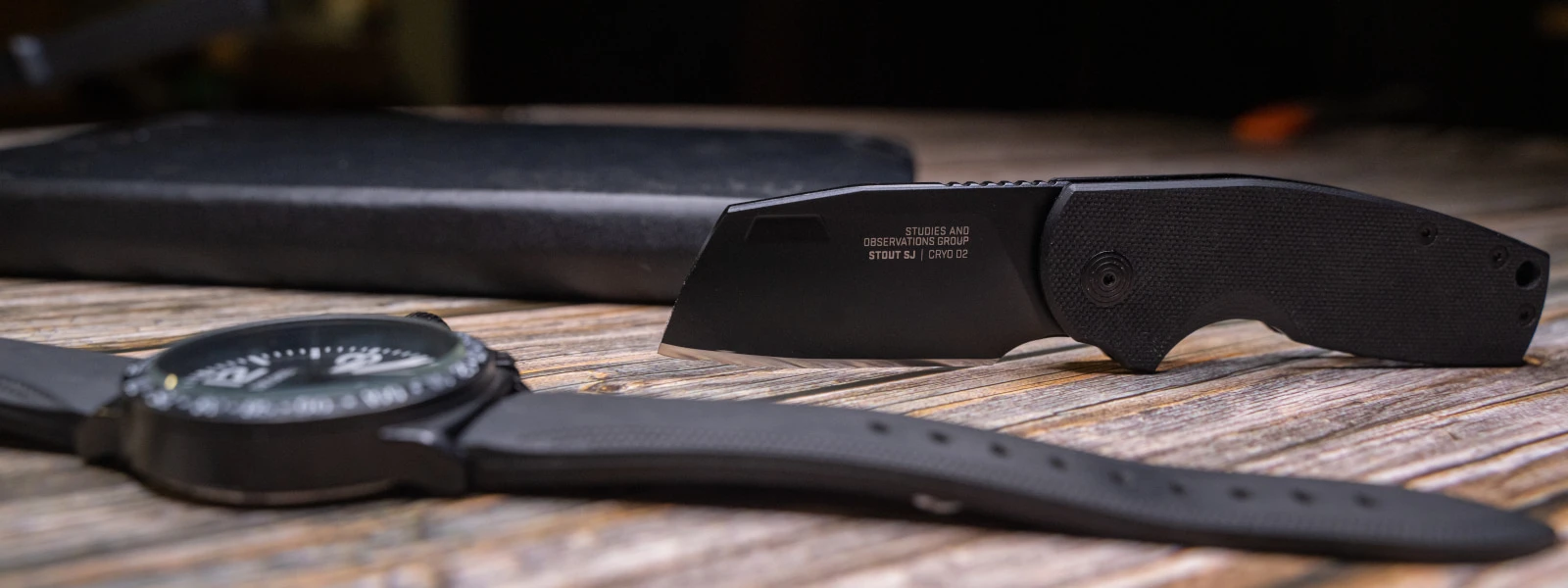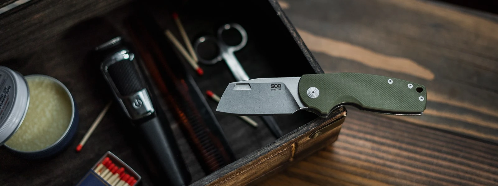 Sog Stout SJ Cleaver – je malý, EDC zavírací nůž, který je vhodný pro legální nošení ve většině států světa. Proto má krátkou čepel bez špičky, která neodporuje zákonům a nemá pojistku proti nechtěnému zavření. Slip Spoj je elegantní pojistný mechanismus kluzného kloubu, který drží čepel otevřenou pružinou a po překonání síly pružiny se ručně zavírá.