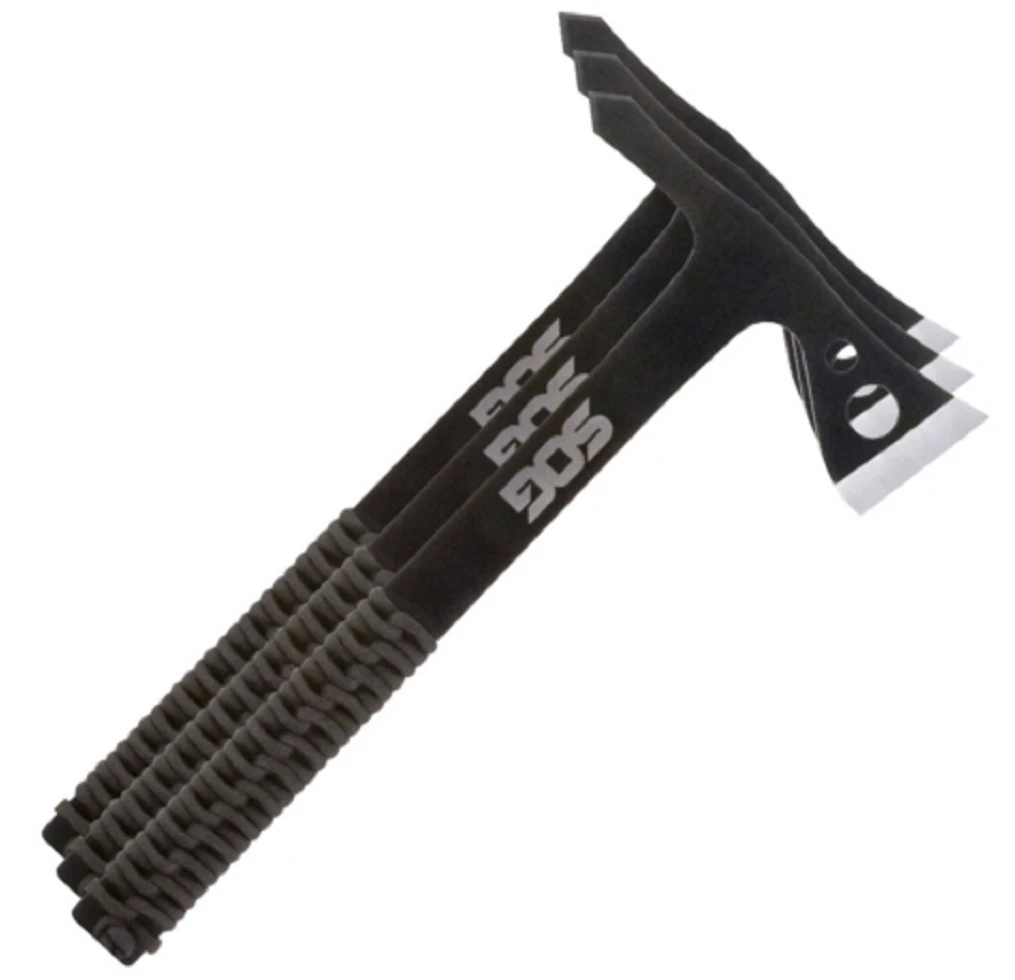 Bojová sekyra SOG Throwing Hawk(3 pack): je to sada tří ocelových sekyr s rukojetí omotanou paracordem, navržené speciálně jako univerzální nástroj pro vojáky, policisty, bojovníky.... Kombinuje tři funkce v jednom nástroji. Obsahuje sekeru, kladivo a páčidlo. Černění snižuje možnost odlesků.