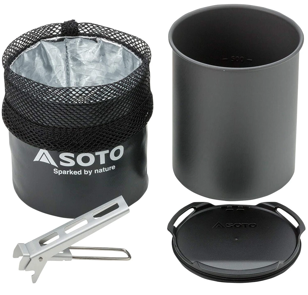 Soto Thermolite: sada na vaření , je ideální na přípravu jídla pro jednu osobu. Set obsahuje hrnec o objemu 750 ml, poklici, kleště a termoobal. Hrnec je vyroben z hliníku s anodizovaným povrchem.