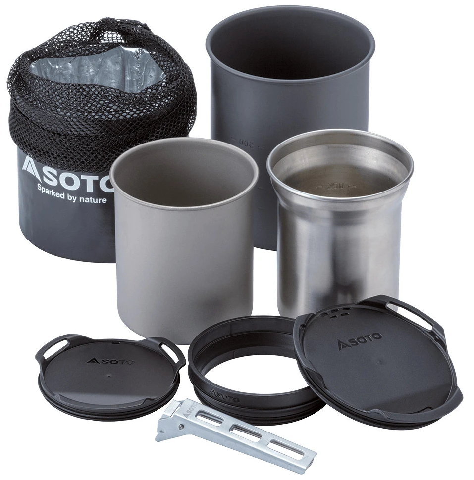 Soto Thermostack + Cook Set Combo: je sada na vaření a přípravu kávy nebo čaje. Sada obsahuje velký hrnec(750 ml) z lehoučké titaniové slitiny. V hrnci jsou vloženy dva menší pohárky z titania a nerezové oceli(400 a 350 ml).