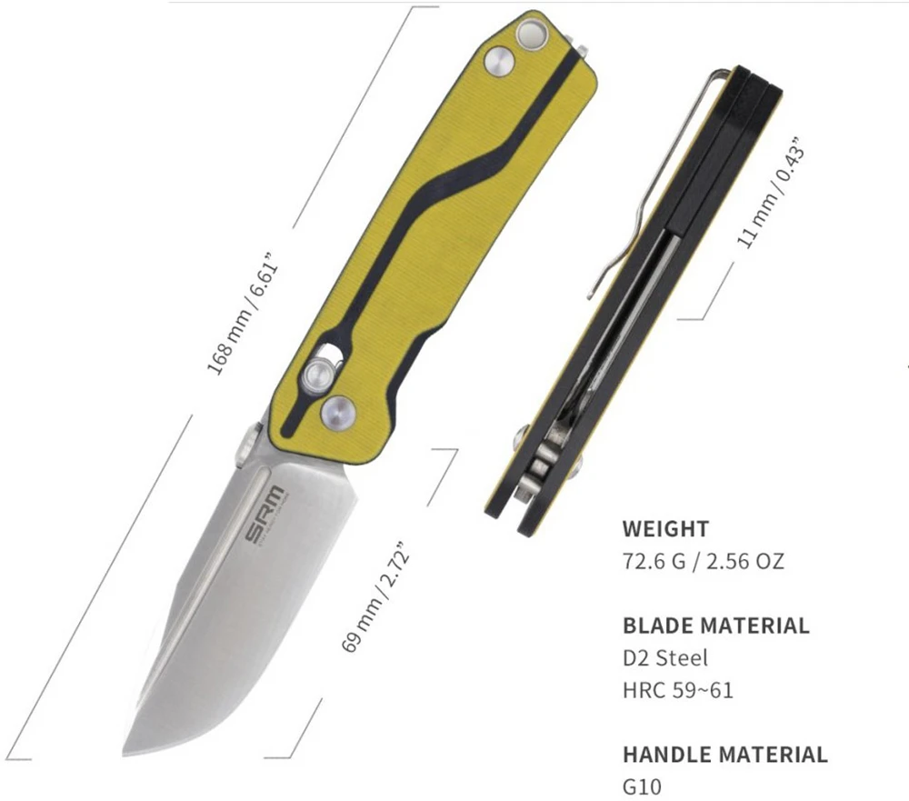 SRM 7228: menší zavírací EDC nůž pro každodenní použití. Čepel má hladké ostří a je vyrobena z velmi tvrdé nerezavějící oceli D2, která perfektně drží ostří. Rukojeť je vyrobena z pevného a odolného kompozitního materiálu G10. Nůž má pojistku Ambi Lock. Klip pro upevnění za opasek či do kapsy.