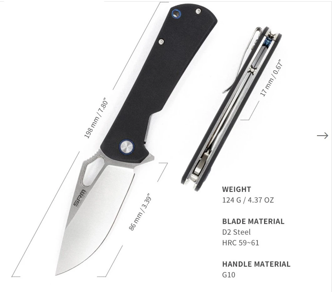SRM 1168: zavírací nůž vhodný pro každodenní použití tak zvaný EDC. Čepel má hladké ostří a je vyrobena z velmi tvrdé nerezavějící oceli D2, která perfektně drží ostří. Nůž se dá otevřít jednou rukou a má spolehlivou pojistku typu Liner Lock. Rukojeť má protiskluzovou úpravu pro pohodlné držení. Klip pro upevnění za opasek či do kapsy.