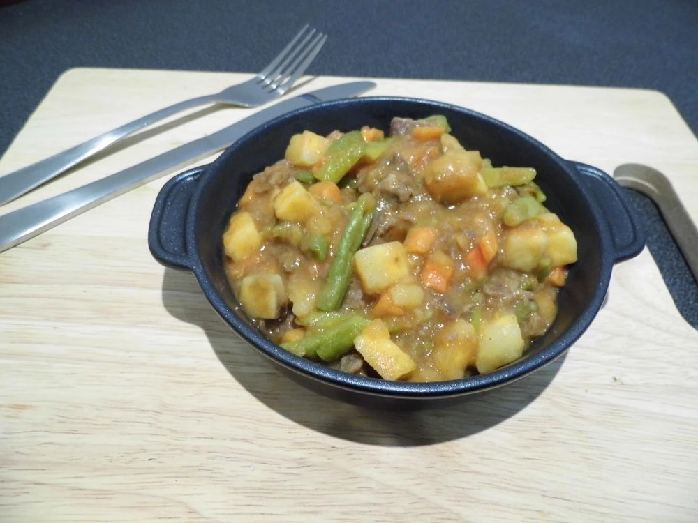 Složení: Brambory (38%), dušené hovězí maso (14%), mrkev, zelené fazolky, cibule, řepkový olej, rajský protlak, kukuřičná mouka, sůl, bílý pepř.
