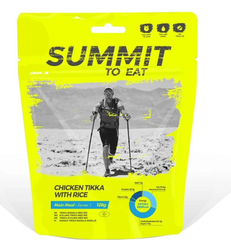 Summit to Eat Kuře Tikka s rýží: i v nehostinných končinách naší zeměkoule si díky tomuto výrobku můžete dopřát chutný oběd nebo večeři. V tomto lehkém sáčku najdete uvařený plnohodnotný pokrm vysušený hlubokým zmražením. Doplníte – li horkou tekutinu a chvíli počkáte, můžete si pochutnat na stravě, jakou vaříte doma.