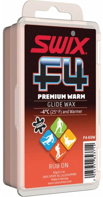 Swix F4-60W Warm 60 g - je určený pro teploty -4°C a teplejší počasí. Tento lyžařský vosk je ze série Easy Wax Line. Není u nich potřeba na zažehlení žehlička. Zakorkují se a můžete vyjet. Zažehlovací korek je na zadní straně krabičky.