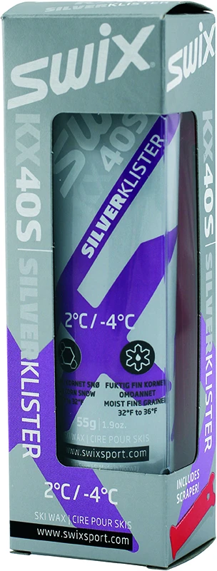 Swix KX40S stříbrný 55 g +2°C až +4°C - je klistr, který se používá přeměněný a jemnozrnný sníh. Zajímavý pro suchý sníh. Je dobrý pro teploty nad nulou.