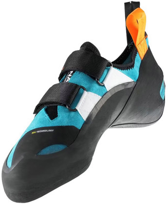 Zapínání je na suché zipy, to je ideální pro lezení na umělých stěnách, kde se rychle a pohodlně nazujete i vyzujete. Lehce asymterická konstrukce.