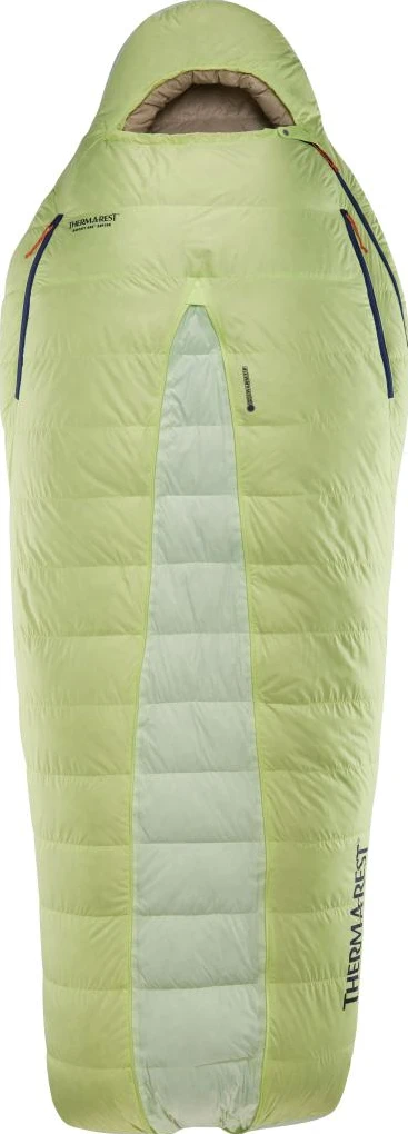 Naopak rozepnutím zipu lze získat prostorný obdelníkový tvar pro větší pohodlí. Výplň spacáku je z impregnovaného kachního peří o plnivosti 650 s hydrofobní úpravou a certifikací RDS.