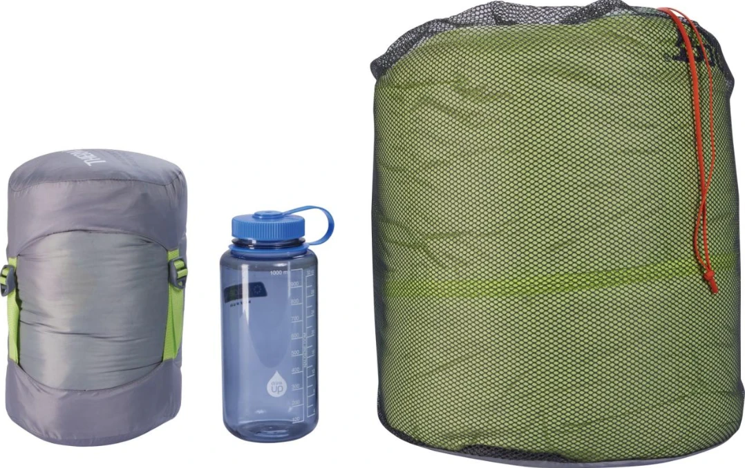 Uvnitř stahovatelné kapuce spacího pytle je límec, který zamezuje tepelným ztrátám. Vrchní vrstva a podšívka jsou vyrobeny ze 100% recyklovaného nylonu s certifikací GRS, který je měkký na dotek a potažen vodoodpudivou vrstvou bez PFAS.