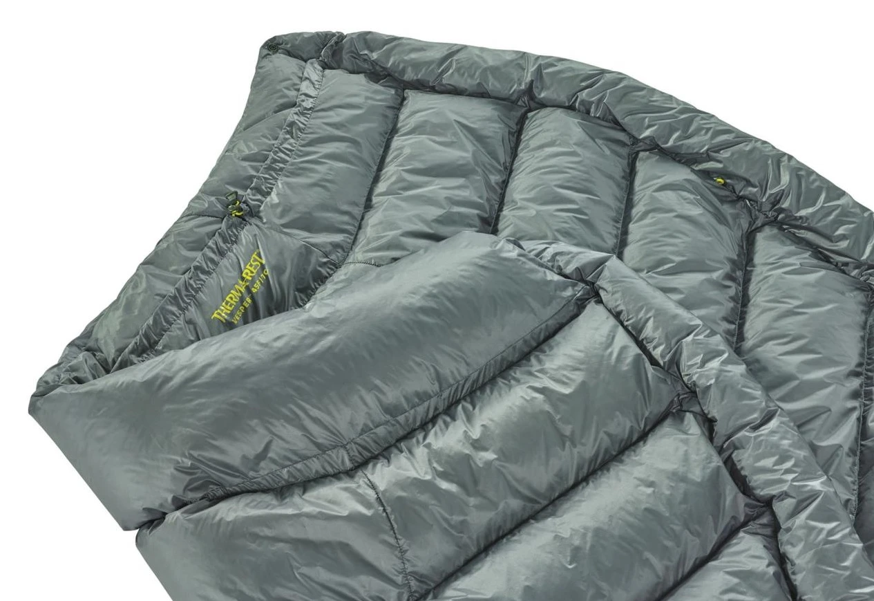 Therm-a-Rest Vesper 45F/7C: Jedna z nejlehčích péřových přikrývek na trhu vhodná především pro letní stanování a cestování. Je speciálně navržena aby vám poskytla maximální pohodlí, dostatečné teplo, a zároveň minimální zátěž. Praktickým doplňkem karimatky jsou integrované strečové popruhy, které slouží k přichycení přikrývky k vaší karimatce. Kapsa na nohy zajišťuje potřebné teplo a pohodlí při spánku.
